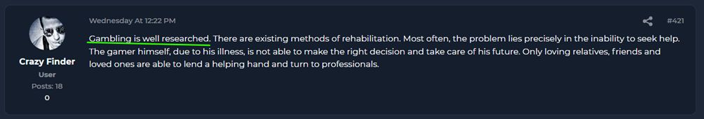 “Gambling is well researched. There are existing methods of rehabilitation. Most often, the problem lies precisely in the inability to seek help. The gamer himself, due to his illness, is not able to make the right decision and take care of his future. Only loving relatives, friends and loved ones are able to lend a helping hand and turn to professionals.”